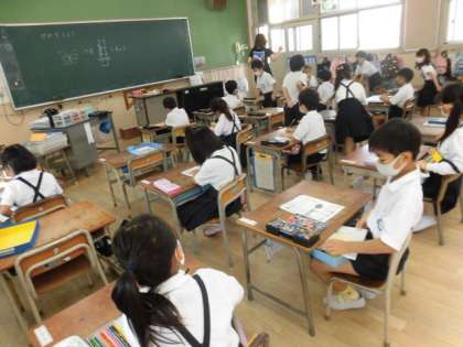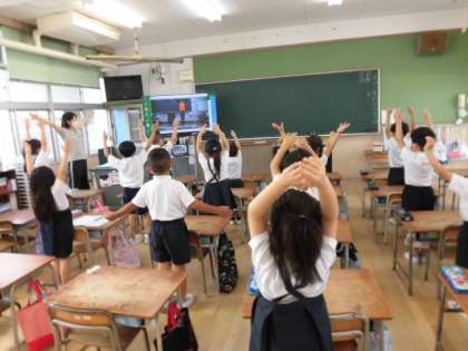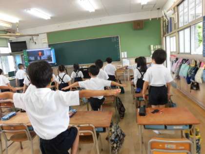 1組はきたたつタイムで、体幹トレーニングをしています。体幹を鍛えていこうね。2組は、土曜日に行った「学校たんけん」の振り返りをしながら、絵を描いています。