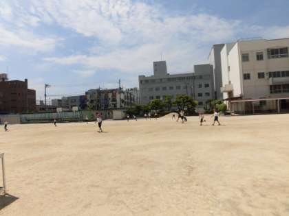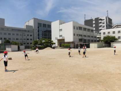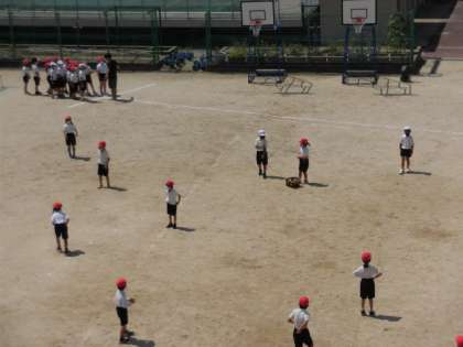 2年生の2時間目は、体育の授業です。鬼ごっこで準備運動をしてから、50m走のタイムを計ったり、ソフトボール投げの練習をしたりしました。