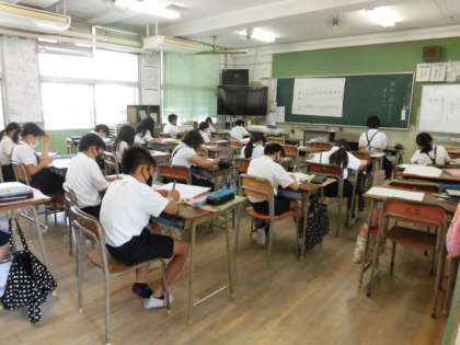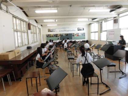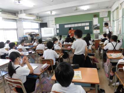 1組はC-NETの先生と一緒に、動画を見て、「何曜日に何をしていたか?」についての質問に答えていきます。2組は音楽です。教室と音楽室に分かれます。音楽室では「ねこ吹いちゃった」をリコーダーで吹けるかの確認を、一人ずつしていきます。