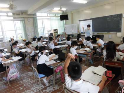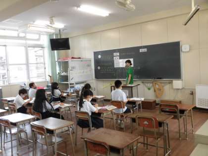 1組は国語です。先生のお話を聞いて、レポートにまとめる時の注意することを学習しています。2組は算数です。割り算のいろいろな考え方について、学習をしています。