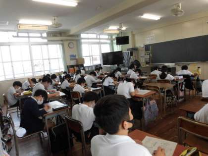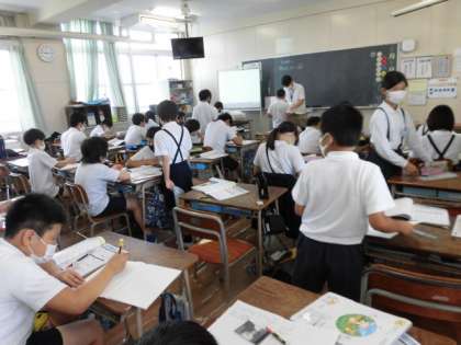 1組は社会「日本の国土」のテストです。2組は算数の問題の答え合わせをしています。