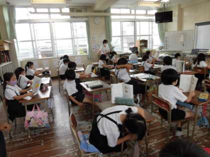 1組は国語で、音読をがんばっています。2組は算数、割り算の学習をしています。