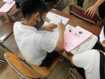 1組は算数、分度器の使い方について、確認テストをしています。2組は国語で、今まで調べてきたことを新聞にまとめていっています。