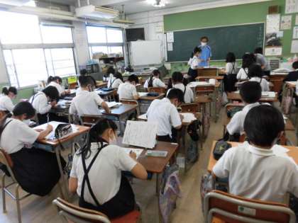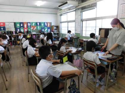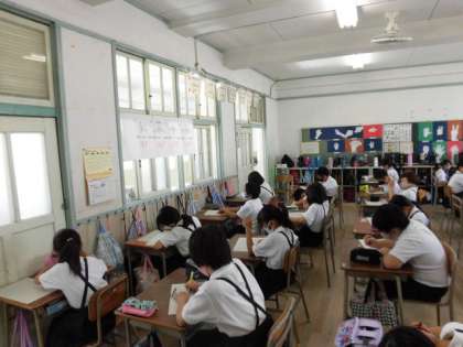 1組は算数「分度器の測り方」について、確認テストをしています。2組は国語のテストです。テスト中も見直しをしようね。