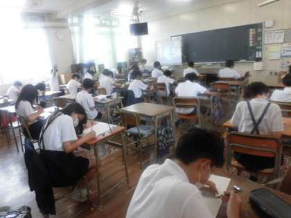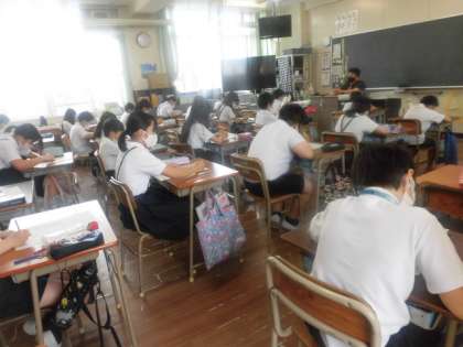 1組も2組も算数のテストをしています。終わった人は見直しもしようね。