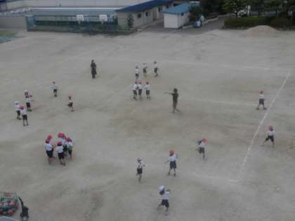 今日は運動場で、グループに分かれてボールを投げる練習をしています。