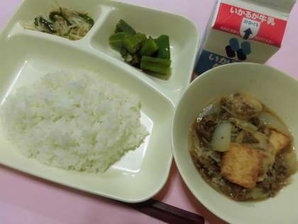 ・すき焼き煮・オクラのかつお梅風味・もやしとピーマンのごまいため