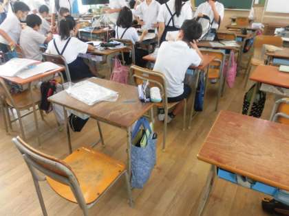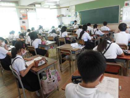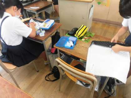 1組は社会のテストをがんばっています。2組は家庭科でナップサックづくりです。完成した人も増えてきました。