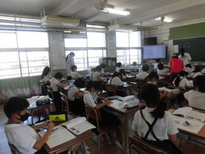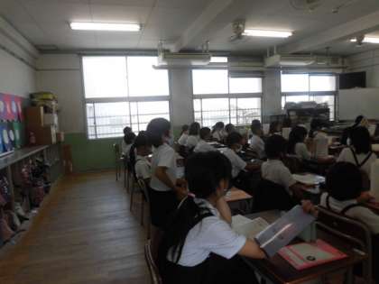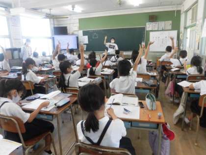 1組は国語です。主人公がどうして、そのような発言や行動になったかを考えます。2組は算数で、自分で作った三角形の辺の長さを測ったり、角度を測ったりしています。