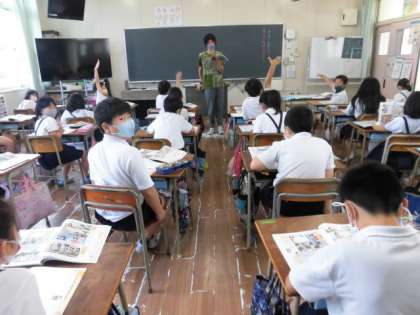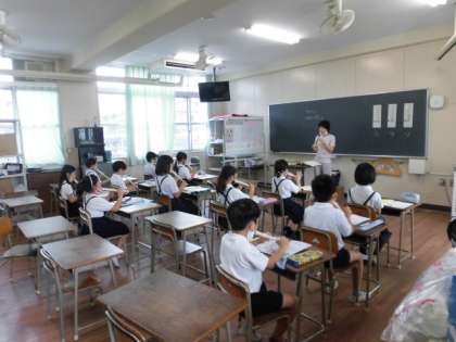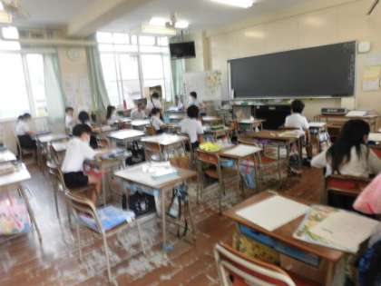 1組は音楽です。リコーダーでシ、ラ、ソを練習しています。教室では校歌の歌詞を覚えています。2組は道徳で「お互いにきもちよく。足りない気持ちはなんだろう」について考えています。