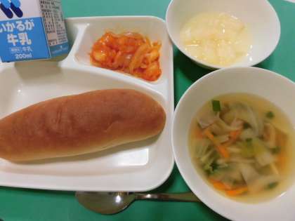 ・えびのチリソース・中華スープ・和なし(缶)・黒糖パン・牛乳 です。