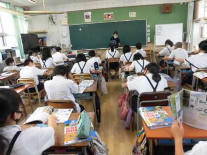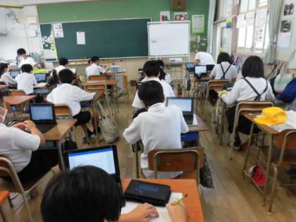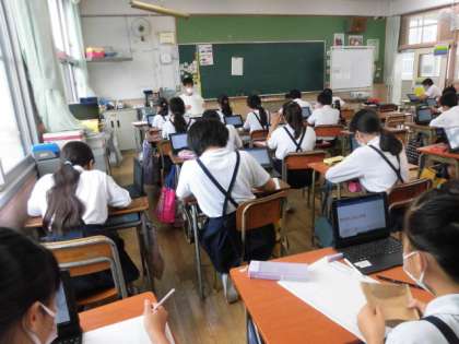 1組も2組も社会の授業です。1組は日本国憲法について、インターネットで調べて、新聞を作っています。2組は今日から「弥生時代」の学習に入りました。