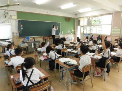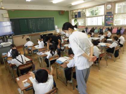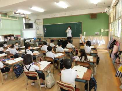 1組も2組も国語です。1組は「こんなことしたよ」で、最後にしっかりと自分がどう思ったかの感想を入れることを、意識して取り組んでいました。2組は絵日記の書き方について勉強しています。
