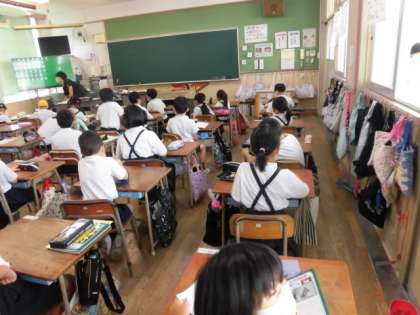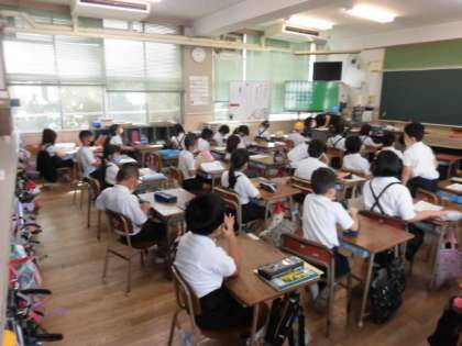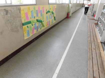 国語で「サツマイモの育て方」の説明について、まとめています。ろうかには七夕でつくった短冊が飾ってあります。また、何をお願いしたか聞いてみてくださいね。