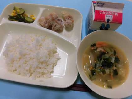 ・鶏肉のからあげ・中華みそスープ・きゅうりとコーンの甘酢あえ