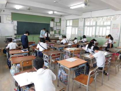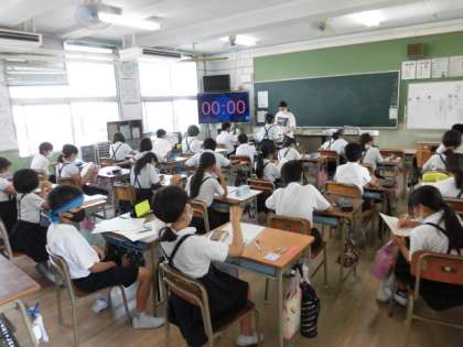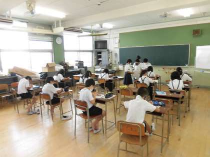 1組は算数のプリント学習をしています。自分の進度に合わせて、どんどんプリントをしていきます。2組は国語で3年生の時に習った漢字の復習をしています。