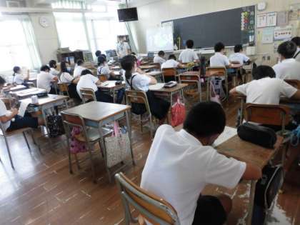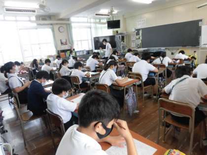 1組は理科で台風についてのテストをしています。2組は社会で沖縄についてのテストをしています。