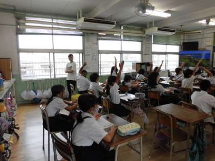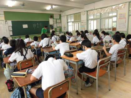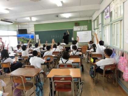 1組は社会で都道府県についてのテストをしています。終わった人は静かに読書をしています。2組は国語で、昨日に引き続き3年生で習った漢字の復習をしています。