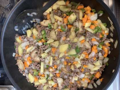 1.ニンニクをみじん切りにして弱火で炒め,香りが出てきたら合いびきミンチを入れます。少し焦げ目がついたらフライパンから出します。