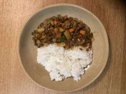3.2に1を加えてなじませ,コップ1杯程度の水を入れ,カレーのルーとガバオライスのルー(なければカレールーだけでもOK)を人数分入れてかき混ぜます。卵をのせればさらに美味しさアップ!