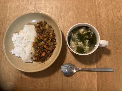4.今回はオクラの余りとわかめ,卵,少しごま油をたらして中華スープを合わせてみました。