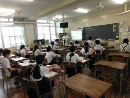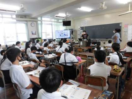1組はC-NETの先生と一緒に英語で「何時に起きますか?」などの簡単な質問に答えています。2組は社会で「野菜・果物・畜産の産地がどのように広がっているか」について学習をしています。
