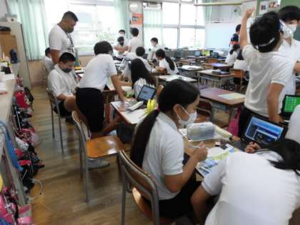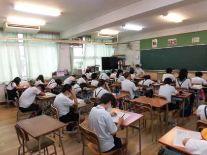 1組は修学旅行で行く鳥羽水族館などをどのように回るかを話し合っています。楽しそうですね!2組は奈良時代などの社会のテストをしています。
