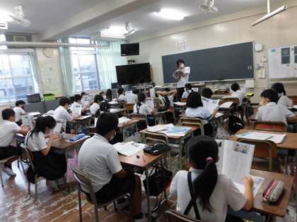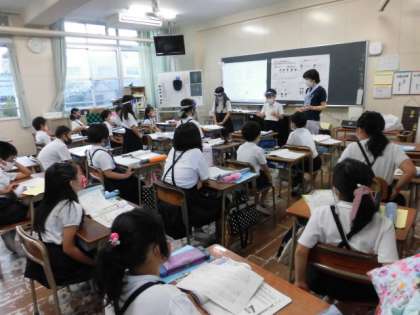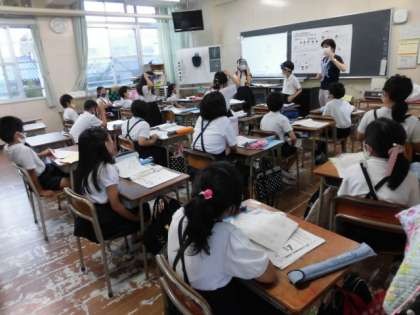 1組は音楽です。自分でつくった音符のリズムに合わせて、4人ずつ発表をしています。2組は道徳で他の国との学校の違いについて考えています。