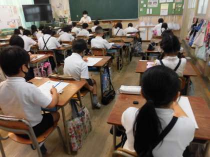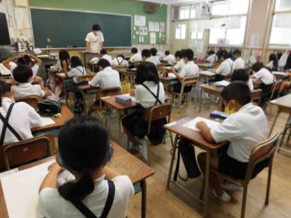 算数で図形のテストをしています。三角形や四角形などいろいろとしっかりと覚えていこうね。