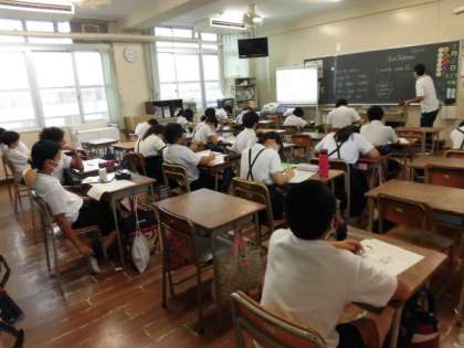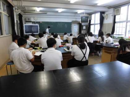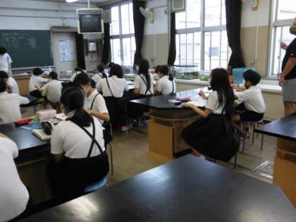 1組は理科で、植物の花のつくりや役割、実のでき方について学習をしています。2組は英語で「何時に何をしていますか?」の表現の仕方について学習をしています。