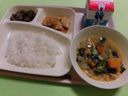 ・焼き鳥・みそ汁・なすのそぼろいため・ご飯・牛乳 です。