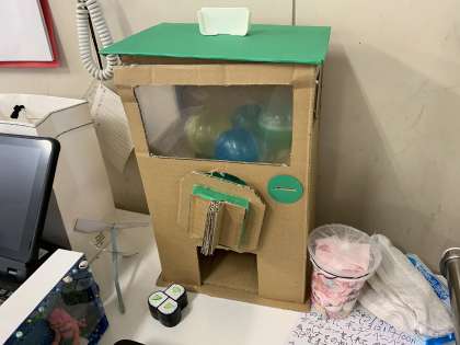 2.ガチャガチャのようなちょきんばこ。まわすとカプセルがでてきます。