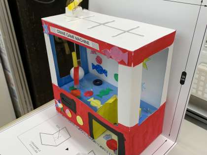 3.ユーフォーキャッチャーがたのちょきんばこ。うえのところでそうさして、ユーフォーをうごかすことができます。