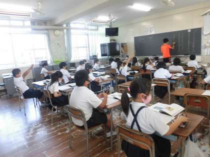 1組は理科でトンボがどのように成長していていくのかを学習しています。2組は国語で「パラリンピックが目指すもの」について、考えています。パラリンピックが閉会したばかりなので、タイムリーですね。
