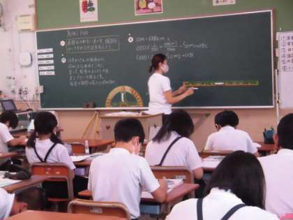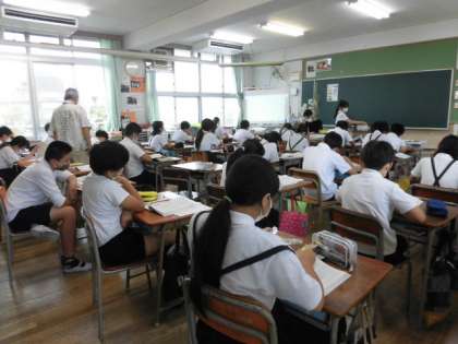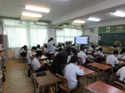 1組は国語で、古文から言葉がどのように変遷してきたかを学習しています。2組は算数で、図形の拡大図や縮図で直接測れないものをどのように調べるかを学習しています。