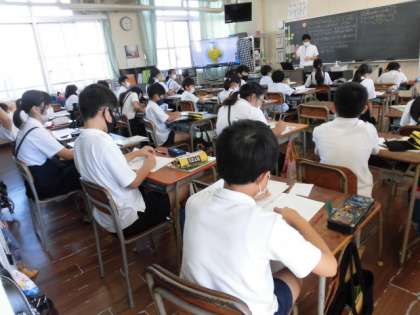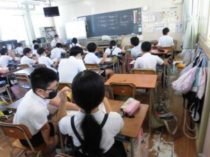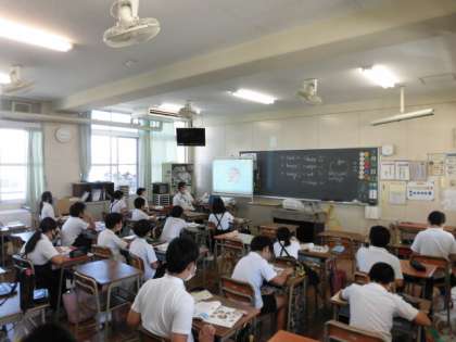 1組は理科で植物の花のつくりや受粉について学習をしています。2組は英語です。人間や動物の映像を見て、表情からどのような気持ちかを考えています。
