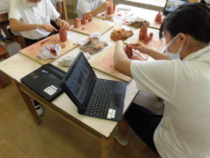 1組は図工室で「はにわづくり」をしています。かわいいはにわができました!中にはマスクをつけているはにわもありました。2組は算数で最小公倍数について学習しています。