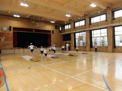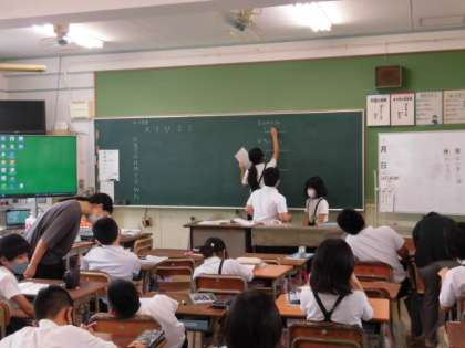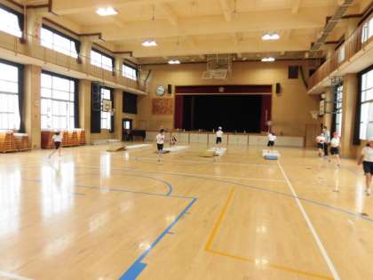 1組はあいにくの雨なので、外で走り幅跳びの練習ができないので、体育館で練習をしています。2組はローマ字の練習をしています。「ぎゅうにゅう」「きっぷ」などややこしそうなものがありますが、できるかな?