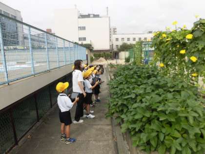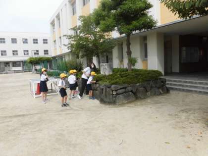2組は生活の授業です。運動場でタブレットに、いろいろな生き物を写真に撮っています。