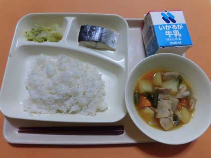 ・さごしの塩焼き・豚肉とじゃがいもの煮もの・キャベツの梅風味・ご飯・牛乳 です。
