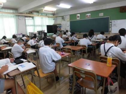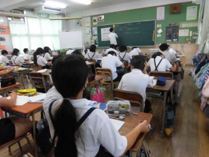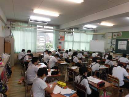 1組は理科です。植物や動物が生きていくためにには、空気や水が必要なことを学習しています。2組は国語のテストをしています。