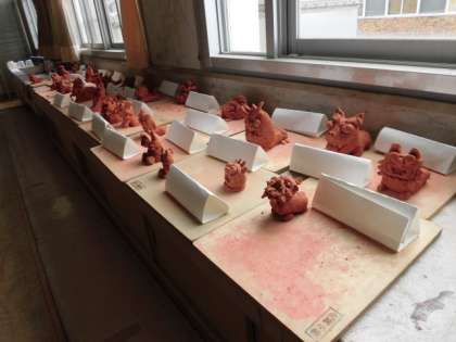 一番上の写真は、図工の授業で作成したシーサーの作品です。様々な表情のシーサーが、図工室にかわいく飾ってありました!