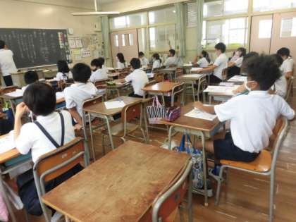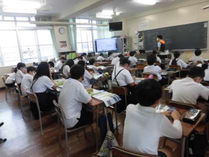 1組は社会で米づくりについて学習をしています。2組は道徳で「古いバケツ」を題材に男子と女子の考えの違いについて、考えています。