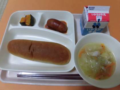 ・フランクフルトのケチャップソース・スープ・焼きかぼちゃ・黒糖パン・牛乳