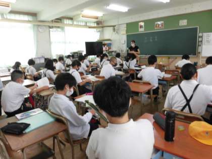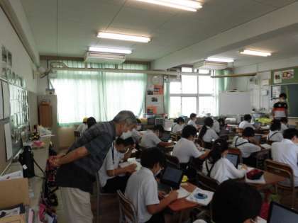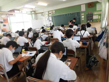 1組は国語で「海のいのち」に出てくる難しい言葉をタブレットを使って、意味調べをしています。分厚い辞書を使わないで、調べることができて便利ですね。2組はテスト返却の後、算数で「円」や「半円」などの面積を求めています。