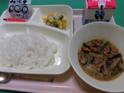 ・マーボーなす・ツナとチンゲンサイのいためもの・いり黒豆・ご飯・牛乳 です。