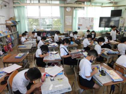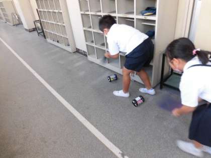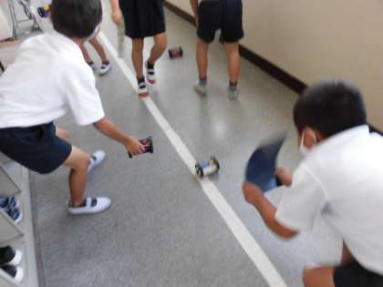 作っていた「おもちゃのくるま」が随分と完成してきました。ボディーの部分の色塗りも終わった人は、実際に下敷きで風をおこして、車が動くかを確認しています。とてもスピードがでている車もありました!