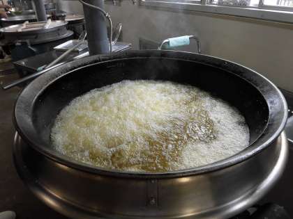 1枚目の写真は、大きな釜で「鶏肉のからあげ」を揚げているところです。