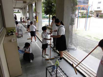 環境委員会の児童が1年生に掃除の仕方を教えてくれています。