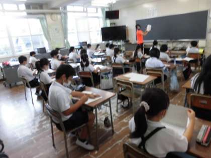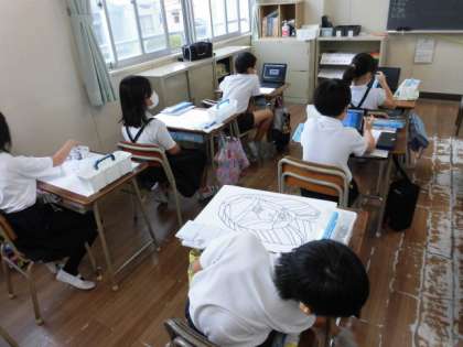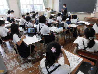 1組は図工で、タブレットなどで調べた昆虫の絵を描いています。水性の絵の具で色を塗っていきます。2組は国語で学習してきた「パラリンピックが目指すもの」のプリントをまとめています。